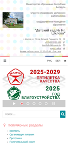 | AI-анализ | The portal "Детский сад 6 г.Шклова" is a government educational institution in the city of Shklov, Belarus. It is part of the Ministry of Education of the Republic of Belarus and the Shklov Regional Executive Committee. The website provides information about the kindergarten, including its address, contact details, opening hours, and administrative procedures. It also offers resources such as forms, popular inquiries, and contacts for various organizations. The site includes sections on the structure of the kindergarten, its staff, and rules for parents. It also features interactive maps of the educational network in the Mogilev region and information on licensing and data protection policies. The kindergarten's activities and goals, as well as job vacancies and parent resources, are also covered. The site is operated by the Shklov Fire and Emergency Service and includes announcements, surveys |