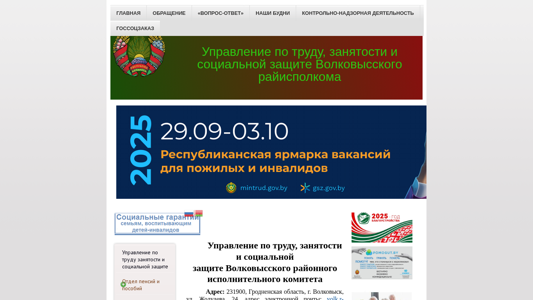 | AI-анализ | The website is that of the Labor and Social Protection Management of Volkovysk Regional Executive Committee in Belarus. It provides information on employment, social security, and related services, including pensions, social benefits, and employment opportunities. Key topics include pension matters, the use of electronic banks for pension payments, and employment procedures. The website includes sections on the history of the institution, its leadership, and contact information, as well as news and announcements. The site is open for public access on weekdays, with specific hours for pension-related inquiries. A dedicated section is available for inquiries regarding funeral benefits, with availability on Saturdays. The domain is soczaschita-volkovysk.gov.by. |
