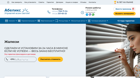 | SEO-описание | Жалюзи купить в Минске под заказ по низким ценам на Abelix.by. Скидка до 68%. Гарантия 3 года. Доставка и установка бесплатно. Звоните по ☎️ +375 (44) 758-71-34 ☎️ +375 (33) 331-63-22 |