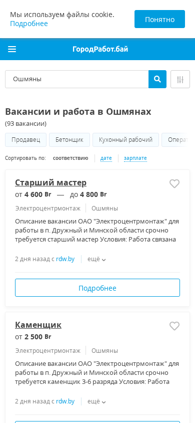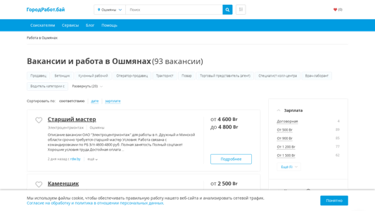 | AI-анализ | language: ru The web project "Oshmyanyi.Gorodrabot.by" is a job search platform for the city of Oshmyany, Belarus. It provides users with over 93 current job listings from local employers. The website offers a quick and convenient way to find jobs in various industries, including construction, healthcare, retail, and more. Users can sort vacancies by salary, date, or industry. One of the featured employers is OAO "Electrotsentromontazh," which is currently hiring a senior master and a mason. The former position involves traveling to Druzhny and the Minsk region, with a salary ranging from 4,600 to 4,800 Belarusian rubles and a full social package. The mason position also requires traveling within Belarus and offers a salary starting at |