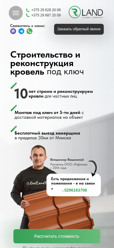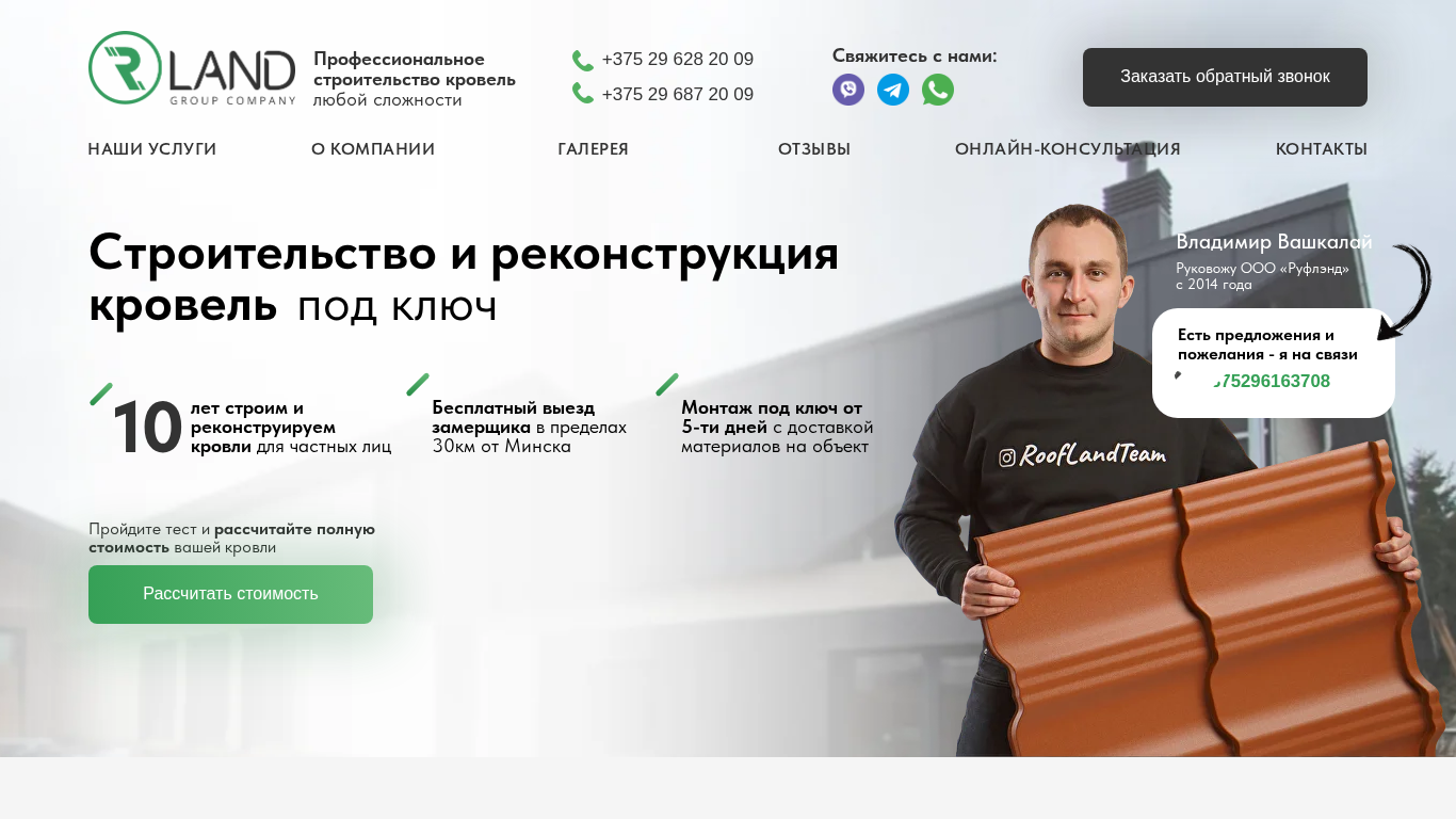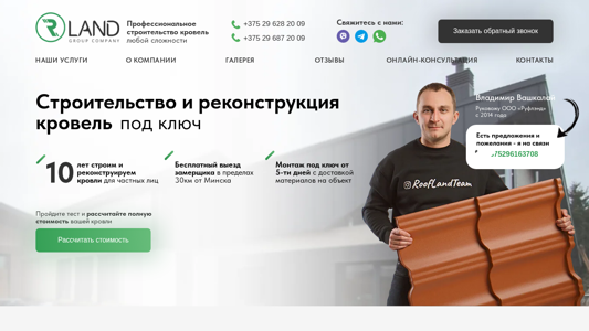 | AI-анализ | --- The portal RoofLand offers roofing services for people with any complexity. Users can calculate the full cost of their roof using a test on the website. The company has been building and reconstructing roofs for private clients since 2014, and offers a free site visit within 30km of Minsk. Services include roof installation, insulation, gutter installation, and more, with a guarantee of up to 60 months. The company employs over 500 brigades and has completed more than 500 successful projects in the last 10 years. Various roofing materials are available, including metal, composite, and bitumen, as well as membranes and insulation. Users can also receive consultations from a specialist or request a callback. The company's contact information is provided. |