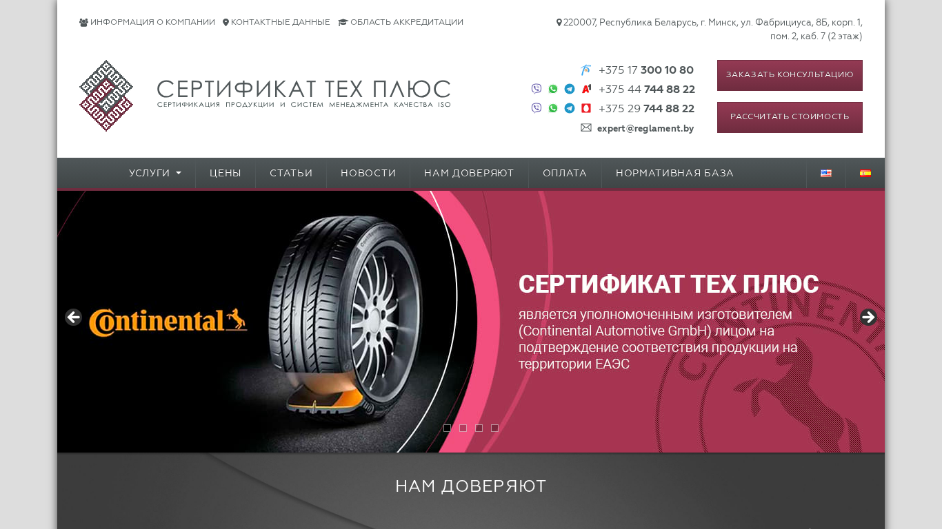 | AI-анализ | The web project "Reglament.by" is a Belarusian company specializing in certification services for various products and systems. The company "Serttsifikat Tekh Plus" offers a wide range of professional services for organizing and ensuring the procedures and schemes of product certification in Belarus and the Eurasian Economic Union (EAEU). The staff of the LLC "Serttsifikat Tekh Plus" possesses extensive experience and qualifications in all areas of certification and standardization, providing clients with confidence that their necessary certification procedures will be evaluated and approved. The website provides information on certifications for various products and services, including but not limited to, safety of railway transport, low-voltage equipment, packing, pyrotechnics, products for children and adolescents, cosmetics, safety of machinery and lifts, auto roads, gas equipment, light industry, transportation and spare |