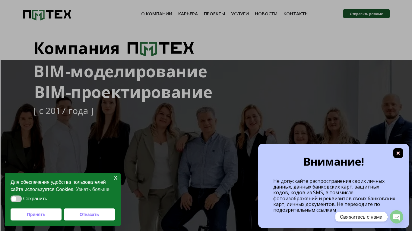 | AI-анализ | This online resource, titled "ПМтех | BIM-моделирование и проектирование" (PMtech | BIM-modeling and project design), is a website of the Belarusian company ООО «Технологии управления проектами» (OOO "Technologies of Project Management") PMtech. The company has been offering comprehensive BIM (Building Information Modeling) services for industrial and civil projects at all stages of construction since 2017. The website provides information about the company, its projects, services, news, and contacts. PMtech employs over 180 staff and has completed more than 300 projects, totaling over 5000 thousand square meters in area. The company's innovative services, utilizing BIM technology, are showcased throughout the project lifecycle, from concept to tender and |