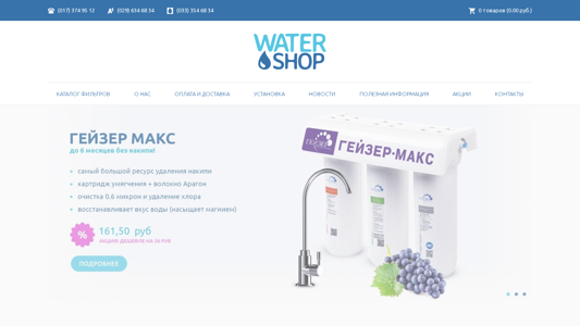 | AI-анализ | --- The portal Watershop is an online shop selling water filters. The catalog includes various types of filters for domestic use, such as filters for tap water, reverse osmosis filters, filters for use with faucets, and filters for central water systems. Customers can find information and purchase cartridges for these filters on the site. The shop offers honest prices and provides photos and descriptions of the products. Filters for both hard and soft water are available, and there is a selection of cartridges for different filter models. The site also includes sections for news, useful information, and promotions. Watershop offers a guarantee on its products and provides information on installation. The contact information is provided for customer inquiries. The shop sells a range of water filters and related products, including the Geyser Smart Max and Geyser Max models, which have a resource capacity of over 7000 liters |