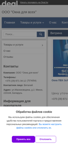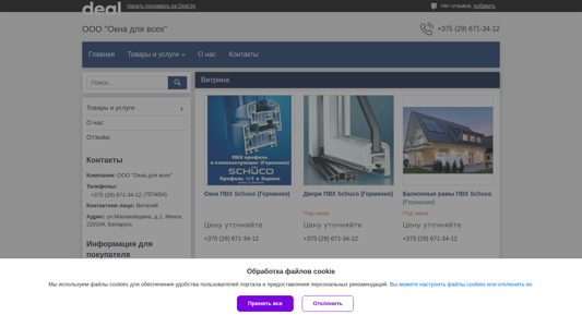 | AI-анализ | --- The web project "ООО "Окна для всех"" offers contacts, products, and services, including PVC windows, doors, balcony rails, and Schuco (Germany) products. Visitors can find contact information, such as phone number +375 (29) 671-34-12 and address at ul. Masюковщина, d.2, Minsk, 220104, Belarus. Products are available for purchase and include PVC windows, doors, balcony rails, and Schuco (Germany) products, which can be ordered with custom prices. The site is built on the Deal.by platform and uses cookies for user convenience and personalized recommendations. |