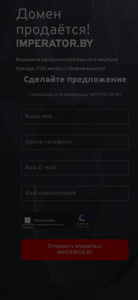 | AI-анализ | This website is the official homepage for the domain name IMPERATOR.BY. The title and description both confirm its status. The content of the webpage includes mentions of the domain being for sale, the possibility of a six-month payment plan, and a monthly rental fee of $20 with the right to buy. Users can make offers and send messages to the domain owner through provided contact details. The website also advertises simple and understandable domain names for businesses, and offers support through chats on Viber and WhatsApp using the phone numbers +375296661285 and +375296666850. |