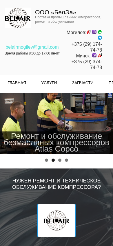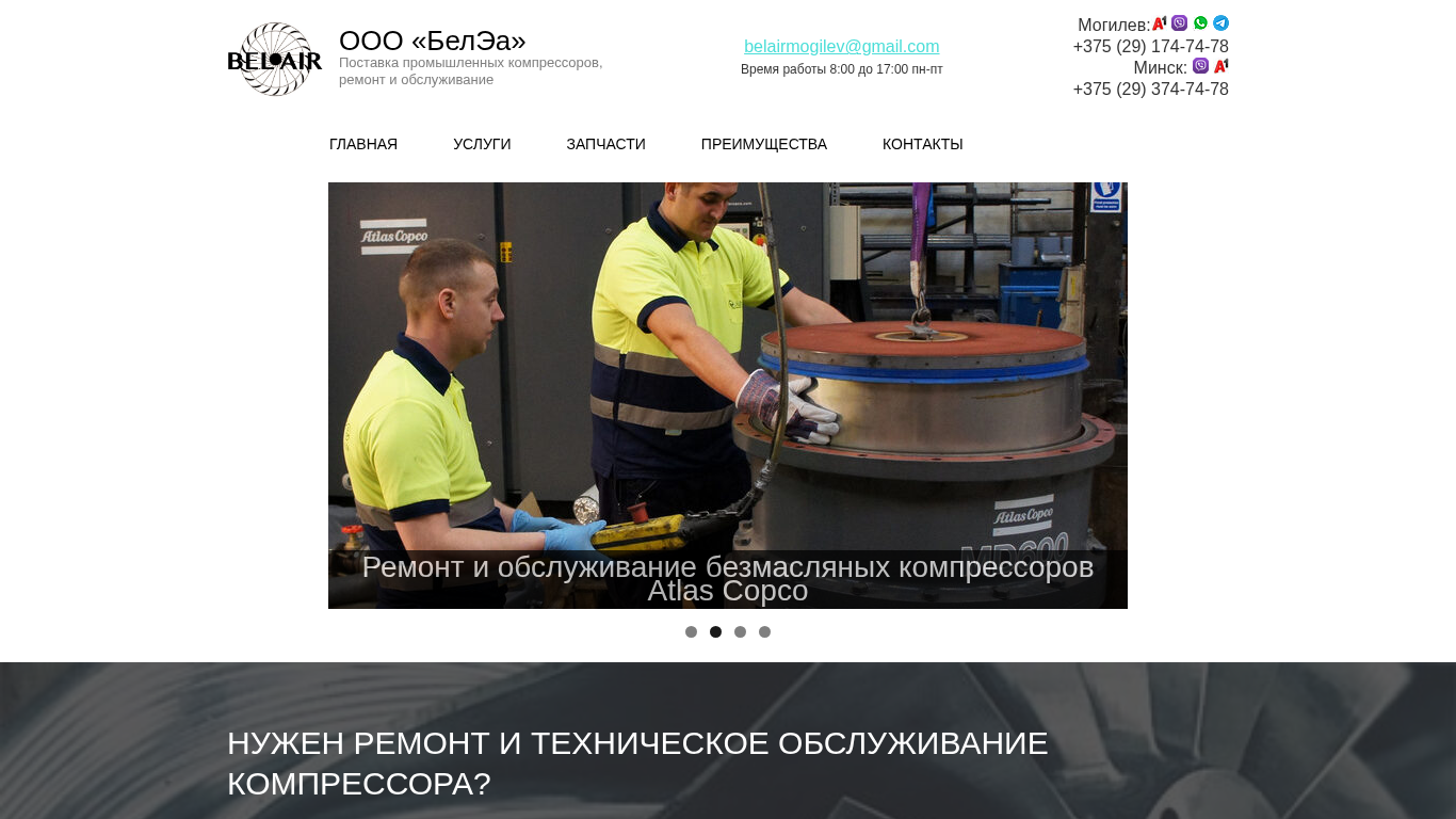 | AI-анализ | The portal Bel-Air.by specializes in the repair and maintenance of industrial compressors in Minsk, Belarus, as well as in Mogilev, Vitebsk, Gomel, Vitsebsk, Grodno, and Brest, among other cities in Belarus. The company offers services for air, screw, turbine and other compressors, as well as refrigeration and adsorption air dryers from Atlas Copco, Ceccato, Almig, Boge, Kaeser, Ingersoll Rand, Gardner Denver, Alup, Fini, Bitzer, Hanwha Techwin (Samsung), Remeza, and Dalgakiran, among others. The company has a large inventory of spare parts and consumables on hand. Highly qualified engineers and technicians, with over 30 years of experience, can perform |