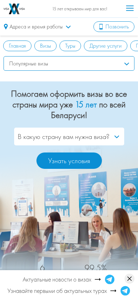 | AI-анализ | This online resource is a visa agency based in Minsk, Belarus. It offers a full range of services for obtaining visas in over 50 countries worldwide. The agency provides quick and high-quality visa support. The website provides addresses and hours of operation for their offices in various Belarusian cities, including Minsk, Brest, Vitsebsk, Homiel, Hrodna, and Mogilev. Their offices are open from 9:00 AM to 7:00 PM on weekdays and 10:00 AM to 5:00 PM on Saturdays, with Sundays being a day off. Their contact information includes phone numbers for Minsk and Hrodna offices, as well as a form to request a callback. The website also states that they have been operating for 15 years. |