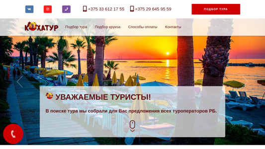 | SEO-описание | Туристическое агентство "Кохатур" предлагает подбор туров из Минска, Могилева, Гомеля, Гродно, Витебска, Гродно, Бреста: горящие туры, авиа и автобусные туры, туры в Египет и другие теплый страны. С "Кохатур" Ваш отдых будет незабываемым! |