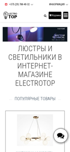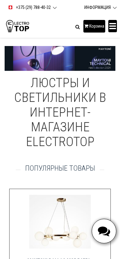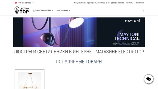 | AI-анализ | --- The website ElectroTOP is an online store selling chandeliers, wall sconces, floor lamps, and outdoor lights under the brand names Maytoni, Technical, Freya, Moderli, Outdoor, Voltega, F-Promo, and others. It offers competitive prices and delivers within Belarus. The catalog features a wide range of products including pendant lights, chandeliers with glass or golden frames, table lamps, floor lamps, outdoor lighting, and LED strips. Contact information includes phone numbers for Grodno and Minsk, and an email address (das_st@mail.ru). The store operates Monday through Friday from 9:00 AM to 9:00 PM, and on weekends by appointment. Popular items include the Maytoni Dallas MOD545PL-11BS pendant light and various categories such as table lamps |