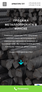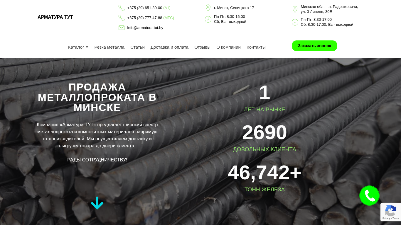 | SEO-описание | Продажа металлопроката в Минске в розницу и оптом от компании Арматура Тут. ✔ Доступные цены. ✔ Консультация специалистов. ✔ Доставка. Звоните: +375 (29) 651-30-00. |