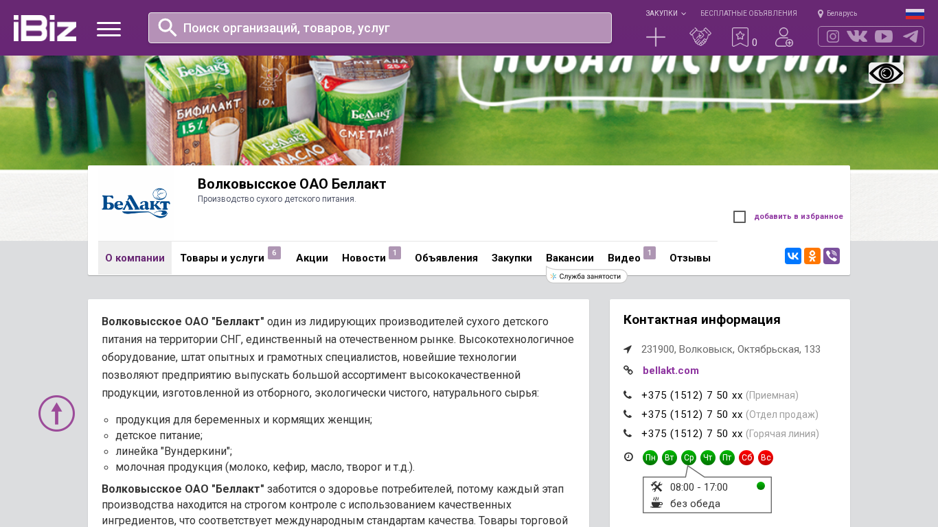 | AI-анализ | This online resource is dedicated to Volkovyskoe OAO Belllact, a Belarusian company specializing in the production of dry baby food. The website provides a map for navigation, contact information, and the company's address: 231900, Voiskovsk, Oktiabrskaya, 133. The site includes sections for company information, products and services, news, job listings, videos, and customer reviews on various social media platforms. Volkovyskoe OAO Belllact is a leading producer of dry baby food in the CIS region and the only domestic company in this market segment. Advanced equipment, an experienced workforce, and modern technologies enable the company to produce a wide range of high-quality products made from select, eco-friendly, natural ingredients. The product line includes items for pregnant and nursing women, baby food, |