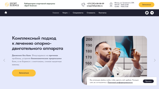 | SEO-описание | Лаборатория спортивной медицины Sport Science — медицинский центр в Минске, объединяющий медицину и спорт для лечения болей в спине, грыж, сколиоза и других проблем опорно-двигательного аппарата. Комплексный подход к тренировочному процессу. Консультация спортивного врача, ортопеда, невролога, массаж, диагностика DIERS. Запись на прием. |