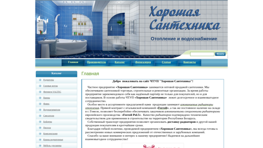| SEO-описание | Добро пожаловать на сайт ЧТУП Хорошая Сантехника! Частное предприятие «Хорошая Сантехника» занимается оптовой продажей сантехники. Мы обеспечиваем сантехникой торговые, строительные и ремонтные организации. За время работы предприятие зарекомендовало себя как надёжный партнёр не только для покупателей, но и для поставщиков. В... |