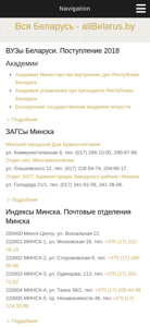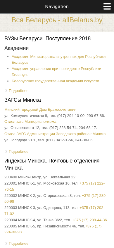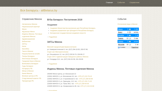 | AI-анализ | language: ru This website, titled "Вся Беларусь - allBelarus.by," is a comprehensive reference guide for various services, institutions, and locations in Belarus, particularly in Minsk. The description mentions "ВУЗы Беларуси" (Higher Educational Institutions in Belarus), "ЗАГСы Минска" (Registry Offices in Minsk), "почтовые отделения Минска" (Post Offices in Minsk), "Индексы Минска" (Indexes of Minsk), and "Справочник Минска" (Minsk Directory). It provides contact details for specific offices and institutions, including addresses, phone numbers, and links to more detailed information. The website also includes sections on events, auto bus terminals, national airport, railway station |