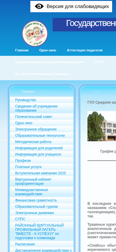 | AI-анализ | This online resource is the official website for Middle School Number 13 in the city of Mozyr, Belarus. It provides information about the school's administration, educational programs, and various initiatives for students and parents. Key topics include attestation of teachers, ideological and educational work, educational technologies, methodological support, parental information, and student services. The website also features sections on financial literacy, educational tourism, and a virtual profiling camp for preparing for olympiads. Additionally, it provides information on the admissions process, a project for parents called "Parent University," and the educational process for the 2025/2026 academic year. The website is operated by the State Educational Institution "Middle School Number 13 in Mozyr." |
