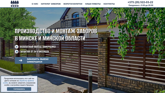| AI-анализ | --- The portal 'Забор Мастер' is a production site for metal fencing, gates, and railings in Minsk. The company offers a free on-site survey and provides a guarantee for 24 months. 'Забор Мастер' specializes in the production and installation of metal fences, gates, and railings in Minsk and the Minsk region. The company offers a variety of fencing styles, including 3D-mesh fences, fences made of metal profiles, metal shaft fences, horizontal shaft fences, jalousie fences, ranch-style fences, modular fences, and welded fences. The site also provides information on fencing foundations. |