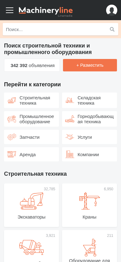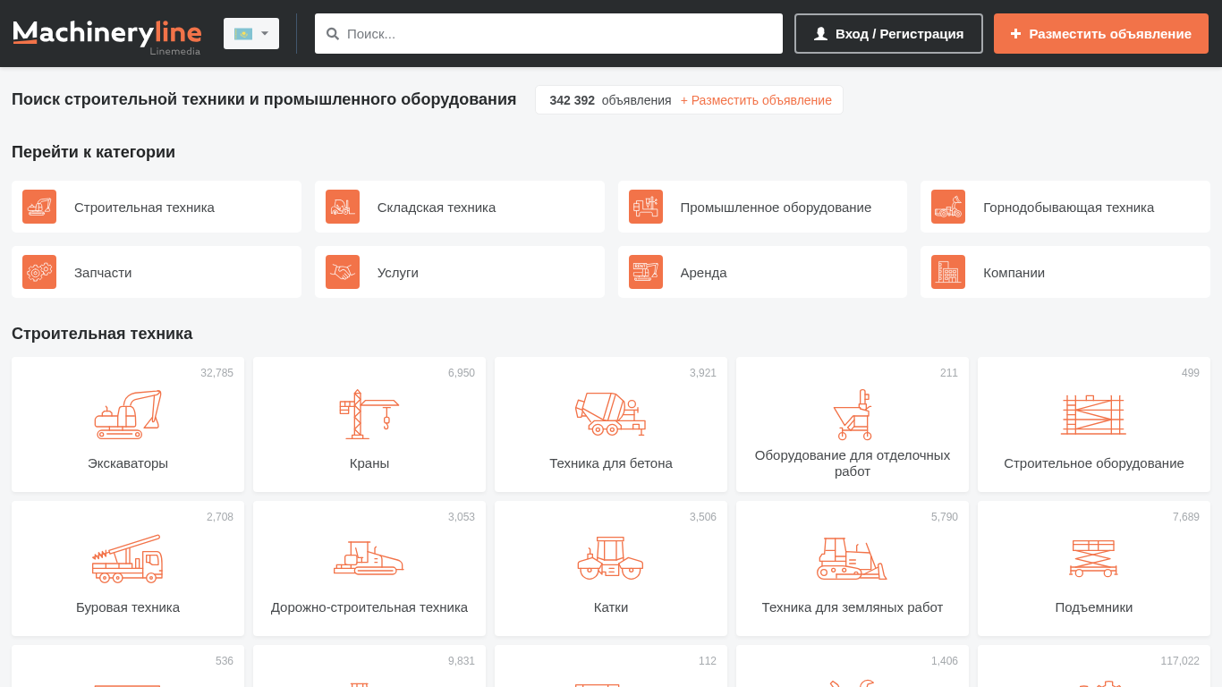 The website Machineryline Казахстан is an online marketplace for the sale of machinery, equipment, and spare parts in Kazakhstan. The site offers a large selection of high-quality machinery for construction, industry, and mining. Users can buy and sell equipment on Machineryline, with categories including construction technology, industrial equipment, and mining technology. The site features 342,392 listings, and users can also list their own equipment for sale. In addition, the site offers categories for spare parts, repair services, and rental companies. Machineryline Казахстан is available in both Russian and English, and users can search for equipment using various categories and filters. Categories include construction equipment such as excavators, cranes, and concrete technology, as well as industrial equipment like metalworking and packaging machinery. The site also offers equipment for mining, transportation, and other industries. Machineryline Каза