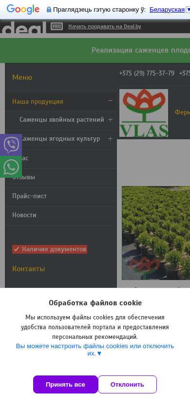 | AI-анализ | The portal is a farming business, "Фермерское хозяйство "Влас", selling fruit tree saplings in bulk. The site includes information about the company's products and contacts. Keywords associated with the site include 'Влас', 'фермерское', 'хозяйство', 'ягодных', 'плодовых', 'культур', and various numbers and contact information. The business is located in Belarus and offers a price list, news section, and documents for customer reference. The company's contact information includes a phone number, email address, and physical address in Жабинка. The business was registered in 2002 and operates Monday through Friday from 8:00 to 17:00, with weekends being holidays. The site offers a cart feature and one customer review. The main product categories are saplings for coniferous |