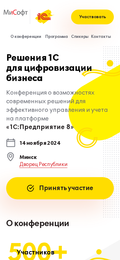 | AI-анализ | This online resource is a website dedicated to the conference "Solutions 1C for Business Digitalization" organized by the Belarusian distributor of the 1C company, OOO "Misoft Trade." The conference focuses on presenting modern solutions for effective business management and accounting on the 1C:Enterprise 8 platform, as well as sharing experiences of implementation projects such as "1C:ERP for Belarus," "1C:Document Flow for Belarus," "1C:Payroll and Personnel Management for Belarus," and "1C:Retail for Belarus," among others. The conference will take place on November 14, 2024, in Minsk at the Palace of the Republic. The program includes a plenary session, industry-specific sections, and an exhibition of software products. Participants will have the opportunity to directly address their |