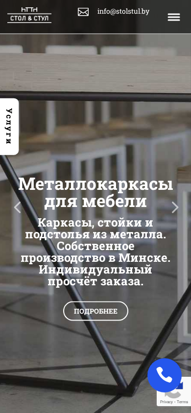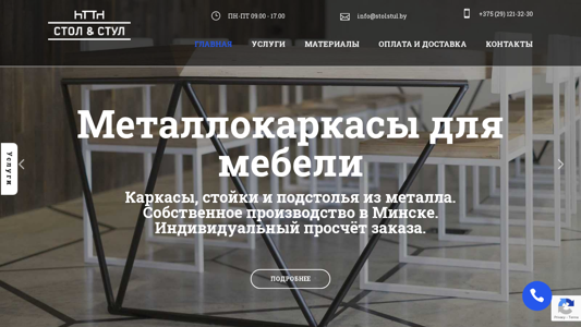 | AI-анализ | The website is dedicated to metal framed furniture, Stol&Stul, offering custom-made metal frames for various types of furniture including chairs, tables, shelves, and cabinets, as well as undercounter and loft-style furniture. The production takes place in Minsk, and customers can request individual pricing for their orders. The website also provides information on polymer coating and powder coating options, with a turnaround time of 1-2 days. Customers can inquire about products and pricing, and contact the company via phone or email. The website features a range of furniture categories including desks, chairs, cabinets, and kitchen furniture. Customers can order custom-made metal frames for their existing furniture, and the company provides services for finishing and customizing the frames. The website also offers a selection of ready-made furniture, and provides a portfolio of their work for customers to view. The company claims |