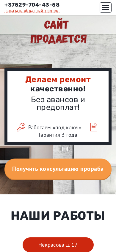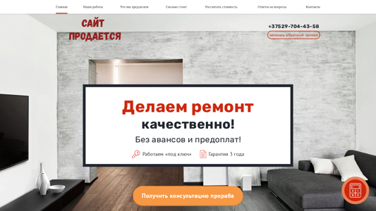 | AI-анализ | --- This website is for a home repair company in Minsk, Belarus, offering repair services under the key with a three-year guarantee and low prices. The title of the website is 'Ремонт квартиры в Минске под ключ по низким ценам' (Repair of apartments in Minsk under the key at low prices). The description mentions 'Ремонт от компании с гарантией 3 года по цене частного мастера' (Repair by the company with a three-year guarantee at the price of a private master). The website includes sections for 'Наши работы' (Our works), 'Что мы предлагаем' (What we offer), 'Сколько стоит' (How much it costs), 'Рассчитать стоимость' (Calculate the cost), |