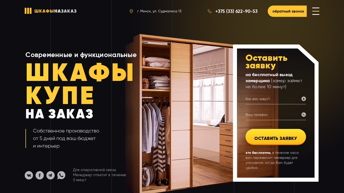 | AI-анализ | This online resource, titled "Шкафы Минск" (Cabinets Minsk), is based in Minsk, Belarus, with the address listed as ul. Sudmalisa 13. The website specializes in the custom production and installation of wardrobes to fit clients' specifications and budgets. They offer free design and measurements using the Bosch system, as well as delivery and installation within a 10 km radius of MKAD. Clients choose this company for its fixed prices, which include materials, delivery, and installation costs, as well as a year of free servicing. The company's 15-year experience in the industry and official warranty of 5 years add to its appeal. Prices for wardrobes are currently reduced by 30% until the end of the month, with discounts available up to 18 April. Clients can request |