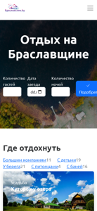 | AI-анализ | The web project "Браславские.by" is a tourist portal for the Braслав Lake District. It offers accommodation search and rental for vacation homes near the Braслав lakes. The site also provides tourist excursions with local guides to the sights of Braслав and its surroundings. Keywords: tourist, accommodation, excursions, lakes, Braслав. The website includes sections on "Where to Stay," a tourist blog, "Excursions," "District Attractions," "Lakes," and "Relaxing at Braслав." Users can find information on various accommodations such as Hutorok by the lake, Guest House Vaspan, Mezhozernaya Estate, Port-Arthur, Free Carp, and Murazhje Estate. Excursions include the Rustyagovsky Trail and an author's animated marathon with quests. Tourists can be |