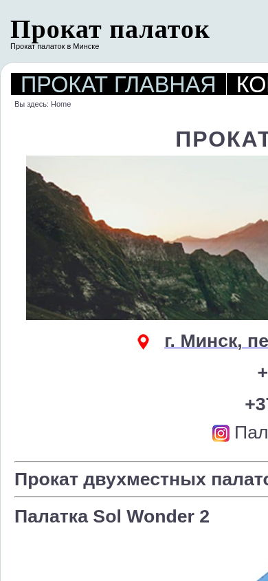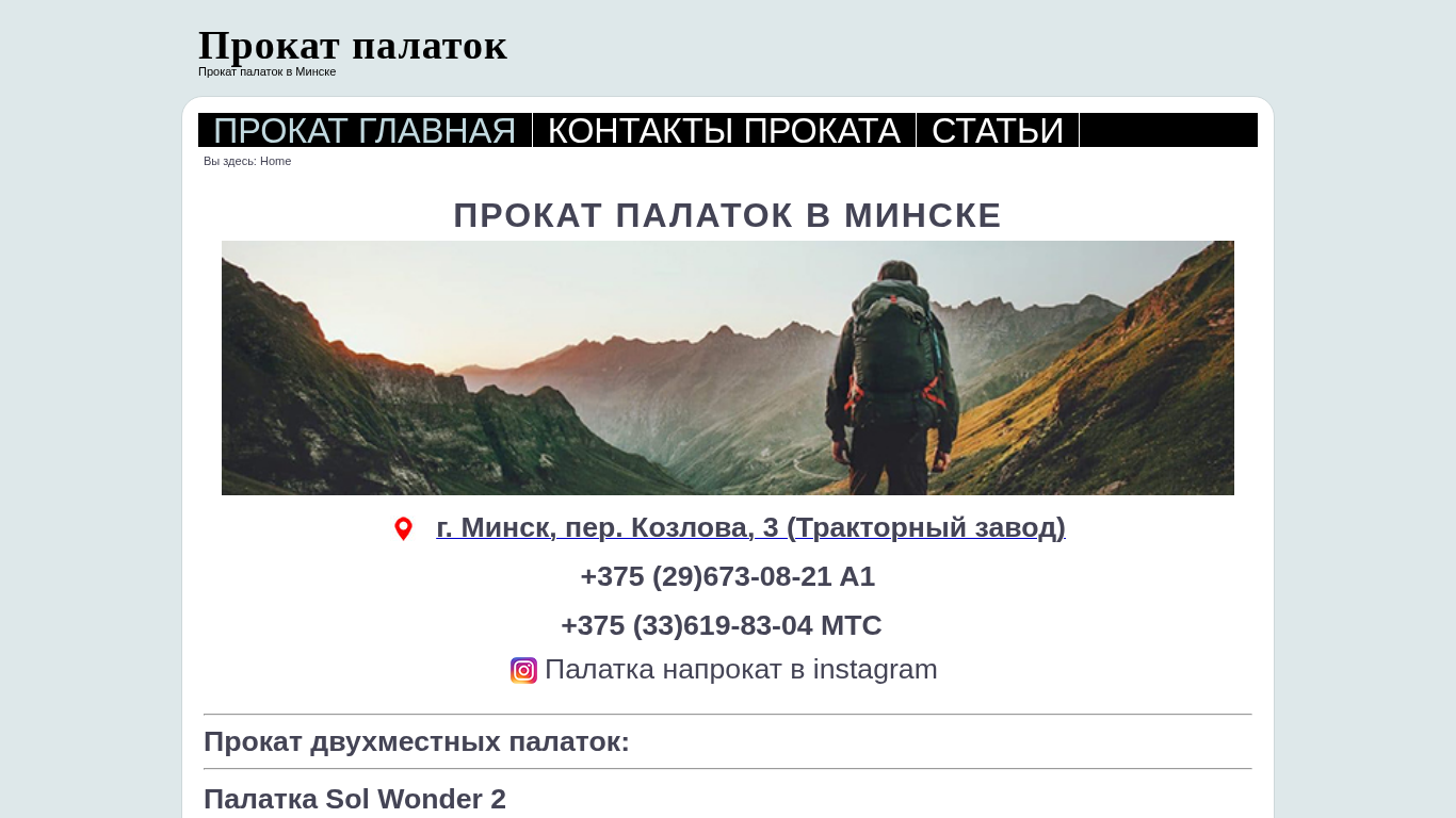 | SEO-описание | Палатки напрокат в Минске. Прокат туристического снаряжения. Качественное снаряжение. Звоните ☎ +375(29)673-08-21. Бронирование, ЕРИП |