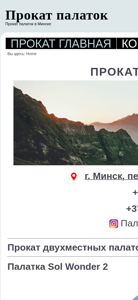 | AI-анализ | --- The portal palatka-naprokat.by offers tent rental in Minsk with various camping equipment for quality rental. Contact +375(29)673-08-21 for reservations and more information. The website provides details on tent models, their prices, and rental durations, including special prices for weekends. Customers can choose from one- to four-person tents, as well as rent sleeping bags, mats, tables, stools, grills, and other camping accessories. Payment methods include both cash and card payments. |
