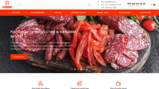| SEO-описание | Где купить колбасу? ⭐ Комвак предлагает колбасную продукцию от лучших мясокомбинатов Беларуси! Купить колбасу по ценам от производителей без надбавок (оптом) на komvak.by. Бесплатная доставка в Минске. ☎️ +375 17 257-91-49. |