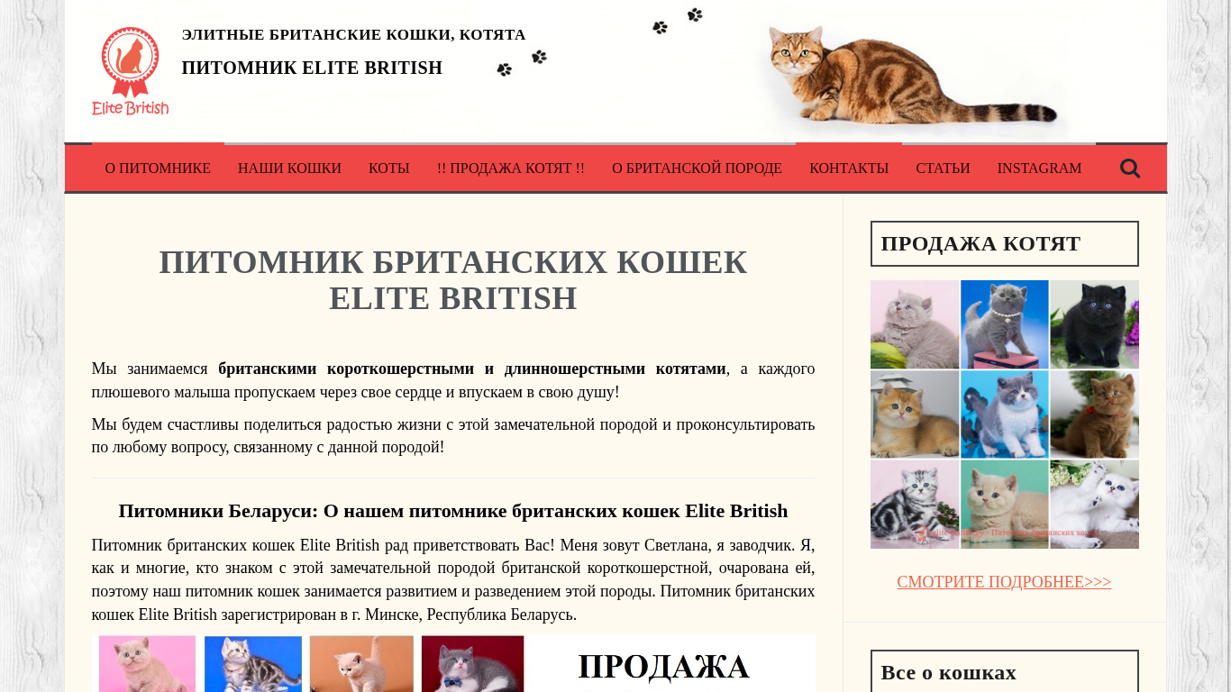 | SEO-описание | Питомник британских короткошерстных кошек, котов и котят Elite British - Питомник породы британцев в Минске, Беларуси - Элитное разведение котят. Редкие окрасы! |