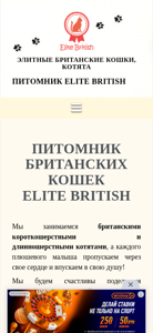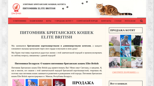 | AI-анализ | This website is a breeder's site for British Shorthair cats in Minsk, Belarus. Elite British features an elite breeding of various colored British cats, including golden, chocolate, silver, and blue breeds, as well as marbled, spotted, striped, and ticked cats and golden British Shinshillas. The site offers information on the breed, including care and feeding, and features articles and photos. Visitors can inquire about purchasing kittens through the site's contacts. |