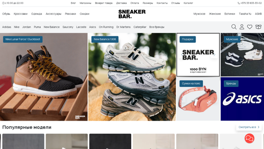 | AI-анализ | The website is an online shoe store, specializing in selling sneakers from popular brands such as Nike, Adidas, Puma, Fila, and Reebok. The store, named Sneaker Bar, offers low prices and is located in Minsk and Grodno, Belarus. It is open from 10:00 to 22:00. The website also includes a blog, information on returns and delivery, payment options, sizes, and contacts. The catalog features a wide range of footwear including running shoes, basketball shoes, casual shoes, winter boots, and boots by various brands. The website accepts payments in BYN and EUR. |