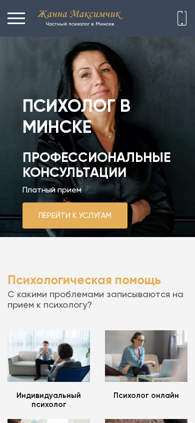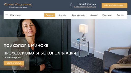 | SEO-описание | Анонимные консультации платного психолога в Минске ➤ Помощь частного психолога ☑ Официальный сайт услуг психолога Жанны Максимчик, запись на прием. |