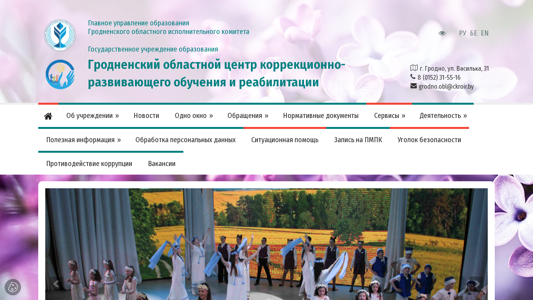 | AI-анализ | --- This website belongs to the Grodno Regional Center for Correctional and Developmental Education and Rehabilitation, an educational institution under the Grodno Regional Education Department. The website provides information on the center's activities, including news, schedules, contact information, and important documents. The center offers correctional and developmental education and rehabilitation services for individuals with various disabilities. The site includes sections on the organization's structure, the work schedule for the administration and staff, and the tasks and functions of the specialists. There is also a section for the primary trade union organization, as well as links to various documents and useful resources. The site features news and updates, a photo gallery, and information on the center's history, traditions, and achievements. The contact information includes a phone number and email address. The site is organized into various sections, including 'About Us in the Media', 'Services', and 'Our |