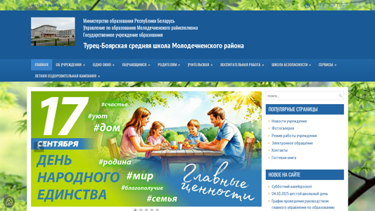 | AI-анализ | This website is for Turets-Boyarskaya Middle School in Molodechno District, Belarus. The title indicates it is a school, and the description mentions "образования" (education) and "учреждения" (establishments), further confirming this. Keywords include "школа" (school), "учителя" (teachers), and "работы" (work), suggesting the site provides information related to the school and its staff. The most frequently occurring words are "октября" (October), "день" (day), and "подробнее" (more), possibly implying a schedule or calendar. The domain name suggests the school is located in the Turets-Boyar area of Molodechno District. |