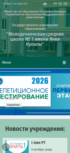 | AI-анализ | The web project is a government educational institution website in Belarusian language for Mолодечненская средняя школа № 1 имени Янки Купалы (Molodechno Secondary School No. 1 named after Jan Kupala). The website provides information about the school, its history, traditions, and achievements, as well as details on its leadership, faculty, and various educational programs. Users can find information on the school schedule, rules, and contact details. The website also features interactive content, such as an interactive map and a museum, as well as electronic services for teachers and students. The site's top keywords include 'подробнее' (detailed), '2025', 'октября' (October), 'образования' (education), 'работы' (work), 'беларусь' (Belarus), 'школа |