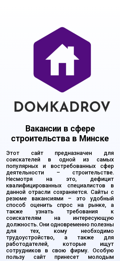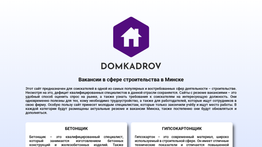 | AI-анализ | The web project 'DomKadrov.by' is a platform for job seekers in the construction and repair industry. Despite the high demand for workers in this sector, there is still a shortage of qualified professionals. Websites with resumes and job vacancies are a convenient way to assess market conditions and learn about the requirements for a specific position. They benefit both job seekers looking for employment and employers searching for staff for their company. Young professionals who have recently graduated and are seeking employment will particularly benefit from this site. The site features current resumes and job vacancies in Minsk, which will be updated and supplemented regularly. A 'bricklayer' is a qualified specialist who deals with the production of concrete structures and reinforced concrete products. In addition, a bricklayer lays foundations, constructs columns, concretes bridge supports, paves roads, and can participate in the production of panels, floor |