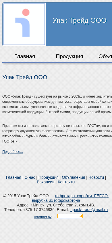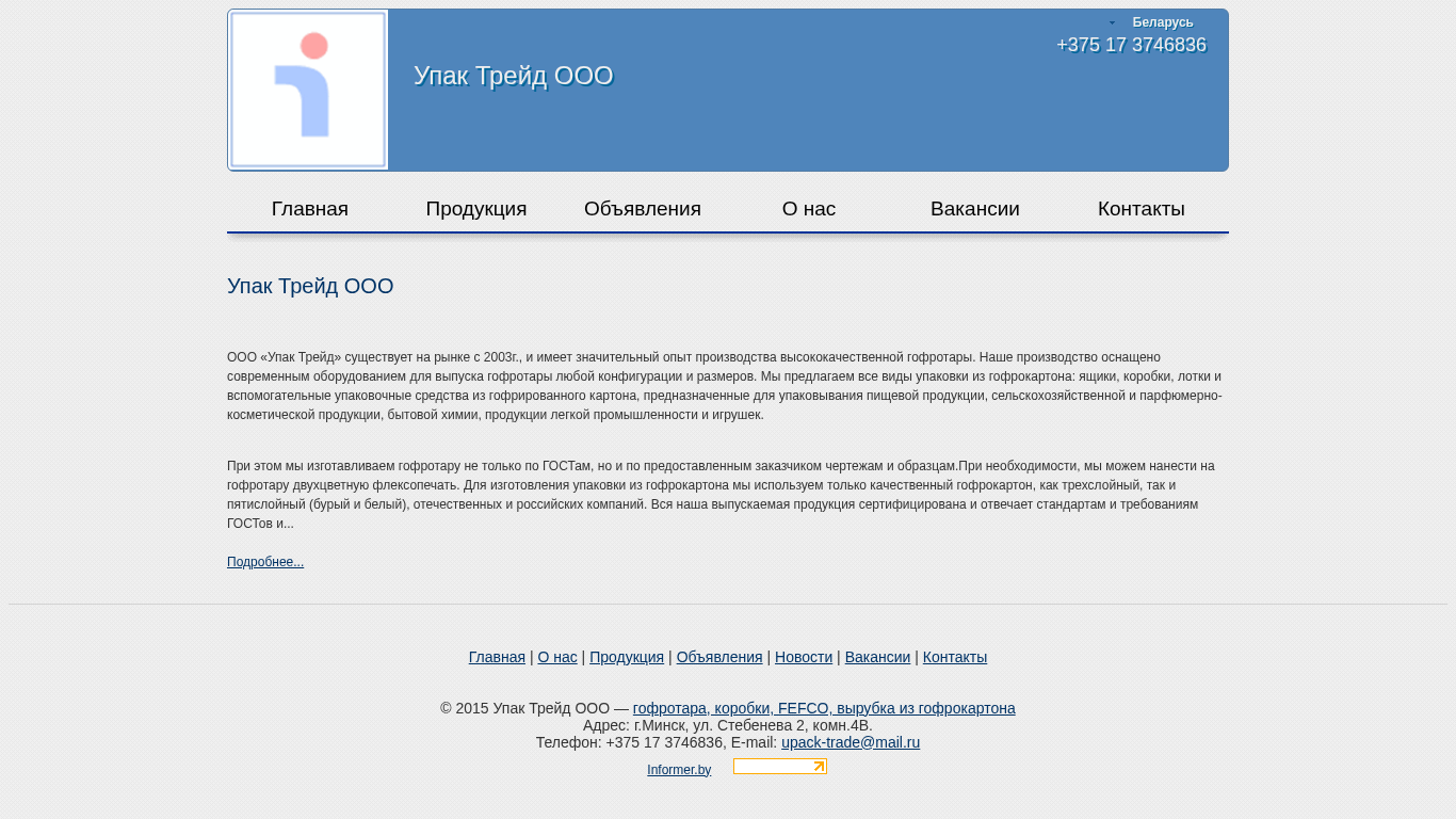 | AI-анализ | language: ru The website is for Upak Traid OOO, a packaging company based in Belarus. Established in 2003, the company has extensive experience in producing high-quality gofrotary (gofrota is Belarusian for carton boxes or tray boxes). The production facility is equipped with modern machinery for producing gofrotary of various configurations and sizes. Upak Traid OOO offers all types of packaging made from gofrokarbon (gofrokarbon is a type of corrugated cardboard): boxes, crates, bins, and auxiliary packaging materials made from corrugated cardboard, suitable for packaging food, agricultural and perfume-cosmetic products, household chemicals, and light industry and toy products. The company can also print the packaging in two colors using flexography. The packaging is made using only high-quality |