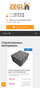 | AI-анализ | This online resource is an e-commerce website named Zegla.by, selling various types of building materials, including keraamzitobeтонные (ceramic concrete) blocks, in the city of Minsk, Belarus. The website offers both self-pickup and delivery options throughout the country, with phone numbers provided for placing orders. The main products for sale are "Термокомфорт" brand ceramic concrete blocks, with various sizes mentioned in the catalog such as 9.3.6 (880х300х580), 12.3.6 (1180х300х580), and 24.3.6 (2380х300х580). Other related items for sale include foundation blocks, paving stones, and various types of column rings. The website also mentions the |