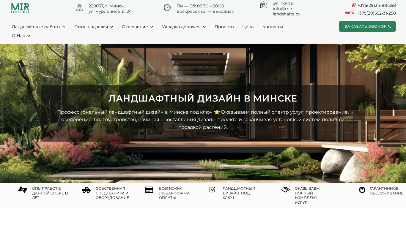 | SEO-описание | Профессиональный ландшафтный дизайн в Минске ⭐ Полный спектр услуг: проектирование, озеленение, благоустройство ✓ Индивидуальный подход ✓ Гарантия качества 100% |