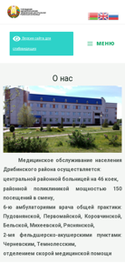 | AI-анализ | The portal 'Dribin Central District Hospital' is a healthcare institution website in Belarusian language. The title is 'Главная' which translates to 'Main' or 'Home'. The description contains words such as 'меню' (menu), 'переключатель' (switcher), 'помощи' (help), 'йская' and 'нская' (first and second district), 'услуги' (services), 'граждан' (citizens), 'медицинской' (medical), '79-1-55' (phone number), 'платные' (paid), 'экстренной' (emergency), 'регистратура' (registration), 'контакты' (contacts), and various other words related to healthcare and hospital services. The language options include Belarusian, A |