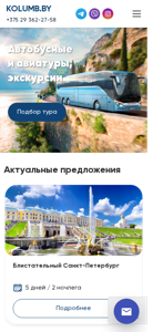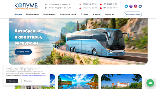 | AI-анализ | The web project "КОЛУМБ туристическое аgентство (Барановичи)" is a travel agency based in Baranovichi, Belarus, located on Lenin Street. The website offers various travel arrangements including bus, railway, and air tickets, as well as personalized tour selection services. The main sections of the site include "Подбор тура" (Tour Selection), "Направления" (Destinations), "Календарь туров" (Tour Calendar), and "Отзывы Агентам" (Agent Reviews). The site also provides contacts for the agency in Baranovichi and Minsk, as well as information on office hours. Promoted tours include trips to Saint Petersburg, Russia, and various destinations in Belarus, Russia, and Georgia, with options for group tours, tours by train, and bus tours |
