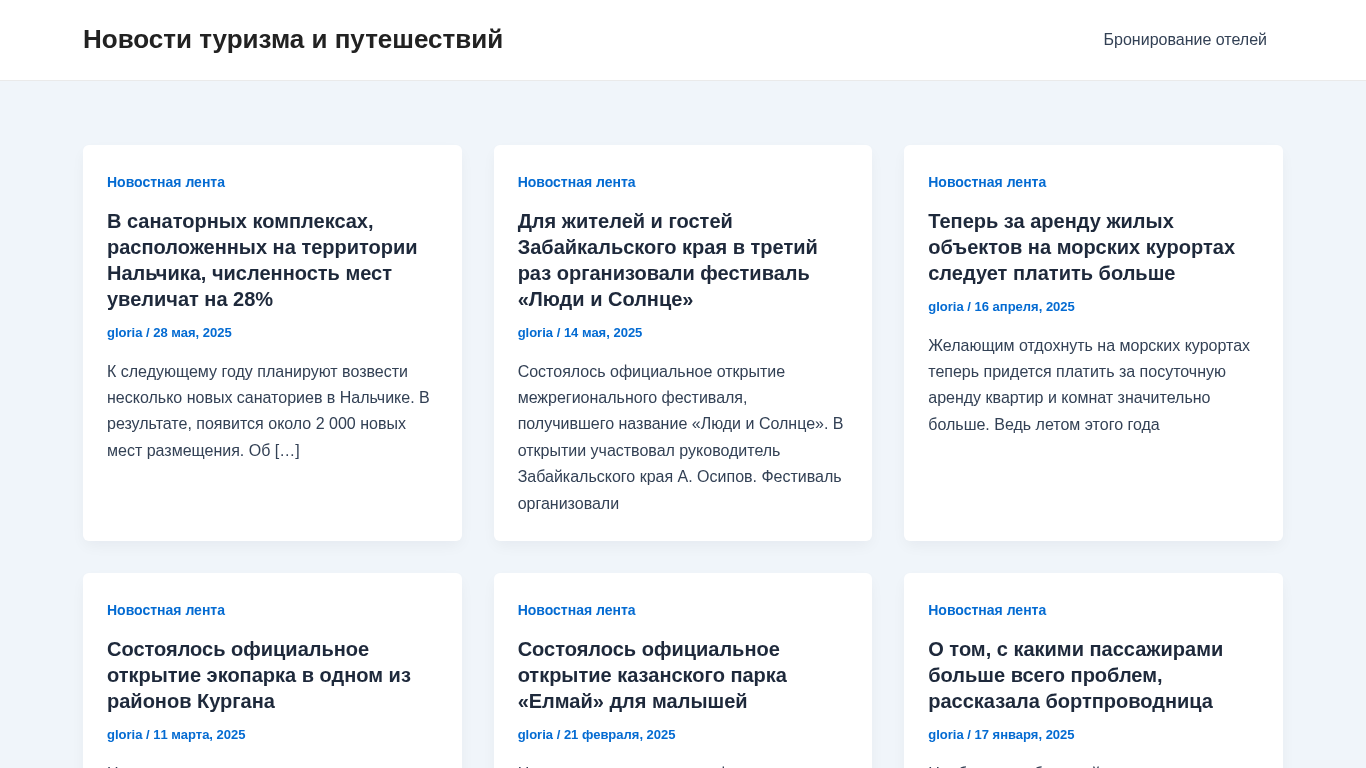 | AI-анализ | The portal Gloria-rest.ru is a news website dedicated to tourism and travel events. It features a news feed with the latest updates on new accommodations, festivals, and other travel-related topics. The website has a significant focus on events in the territories of Nalchik and the broader region of the North Caucasus, with several major events mentioned, including the expansion of sanatorium capacity and the organization of a 'People and Sun' festival. Additionally, the website reports on increased rental costs for living accommodations at seaside resorts and the official opening of a new eco-park in Kurgansky. The portal also includes a section for booking hotels. |