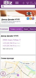 | AI-анализ | The web project "Decor-Dizain CTUP - Interior Decor. Manufacturer of polystyrene decorative elements." is based in Grodno, Belarus, with the address 230026, Победы, 17. This website operates as an interior decor manufacturer specializing in polystyrene products. The contact details provided are two telephone numbers: +375 (29) 784 70 xx and +375 (29) 184 70 xx. The company's UNP number is 391131176. The website includes sections for company information, products and services, mebel korpusnaya (furniture), announcements, vacancies, videos, and customer reviews. The operating hours are Monday through Friday from 9:00 am to |
