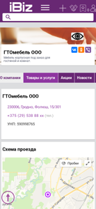 | AI-анализ | --- This online resource is dedicated to GTOmebel OOO, a Belarusian company based in Grodno, offering custom-made furniture for living rooms and other rooms. The website includes a map for directions, contact information with a phone number, and an address at Фолюш, 15/301. The company specializes in corporate furniture and has sections for its products and services, including a catalog of offerings, company news, and job listings. Users can view videos, leave reviews, and contact the company through Viber, VKontakte, and Odnoklassniki. GTOmebel OOO operates from Monday to Friday, 8:00 AM to 5:00 PM, without lunch breaks. The website also features a public agreement and contact information for company representatives. The company is listed under the "Furniture: Custom-made" |