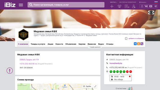 | Название / Заголовок | Медовая семья КФХ - Гречишный мед. Липовый мед. Лесной мед. Полевой мед. Продукты пчеловодства (перга, пыльца, прополис). Пасека более 600 пчелиных семей. Магазин по адресу: г. Гродно, Центральный рынок на ул. Полиграфистов, 6. Роллет № 12 - Медовая семья.. 230025, Гродно, , а/я 119 |