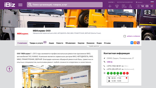 | AI-анализ | This website is an official service center for MAZ, Autodizel' JAMZ, MMZ, Pramotronik, and Weichai Power in Grodno, Belarus. The address is at Понемуньская 27, 230003. The website provides a map for directions, contact numbers, and company information. OOO "МБКсервис" has been providing professional repair services for MAz, Gaz, Kamaz vehicles since 2013. They offer various repair services including computer diagnostics, electrical part repair, autonomous heater repair, engine, transmission, and clutch repair, wheel bearing replacement, suspension system repair, and more. All repair work comes with necessary certifications for warranty and post-warranty service. The company offers competitive prices and high-quality service, with a wide range of spare parts available from original |