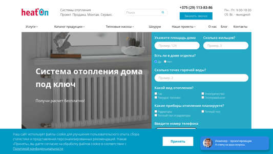 | AI-анализ | The web project "Heaton.by" is a heating system provider in Minsk, Belarus, offering sales, installation, and service. With over a decade of experience, they have heated over 500 homes, and have dedicated departments for project planning, installation, and service. The website includes information on various heating services such as boiler installation, water pipe installation, ventilation installation, and various heating equipment sales. The contact information provided includes phone numbers for calling and emails for inquiries. The business operates from Monday to Friday, 9:00 AM to 6:00 PM, with Saturday and Sunday being holidays. Services offered include the installation of heating systems, water pipe installation, ventilation installation, boiler repair, and borehole drilling for thermal and water pumps. The website also features a catalog of various heating products, including boilers, heat exchangers, and various accessories. |